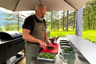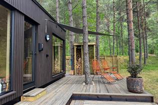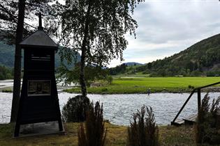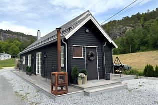 Vakker fiskehytte med utsikt til Barsnesfjorden og Årøyelva