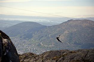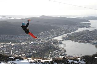 Norges raskeste zipline på Ulriken! Nyt utsikten over byen mens du svever i høy hastighet over bakken på Ulriken, Bergens høyeste byfjell (643 m o.h.).