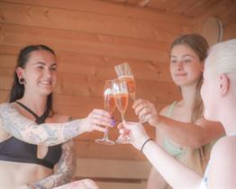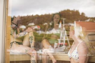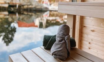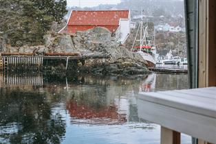 Moderne flytende badstue i idylliske omgivelser ved Strusshamn gjestehavn på Askøy, 20 minutter fra Bergen. Senk skuldrene og nyt panoramautsikt ut mot havnen.