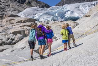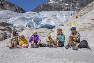 Guida tur til Nigardsbreen utsiktspunkt med naturrettleiar som forklarar og viser korleis breen har forma landskapet og historia om Nigardsbreen.