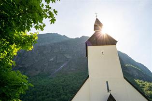 Høyanger Kyrkje er sentralt plassert i bybildet i Høyanger