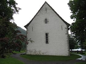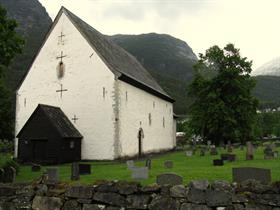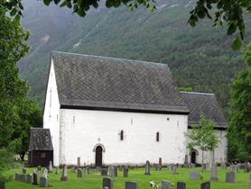 Steinkyrkja i Kinsarvik vart bygd kring 1150-1160, og er i engelsk-romansk stil med rundboga dør-…