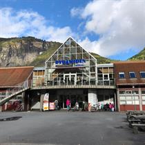 Toalett og stellerom ligger i 2.etasje ved kafeen Nærmaste minibank finn de ved luster Sparebank, 100 meter frå senteret.