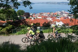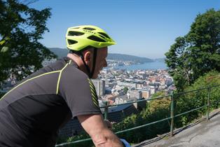 Turforslaget "Se Bergen fra taket" har litt stigning etter 3 km for å komme opp i vakre fjell veien. Men dette er stigninger som alle klarer med sykler med 27 gir. Her får en se Bergen får «taket» med utsikt over alle de kjente stedene. Av høydepunkter nevner vi her: Statuen av Madam Felle, utsikten fra fjellveien, Skansen Brannstasjon, Mariakirken og Bergenhus festning.