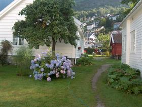 Frå uteserveringa frå Vangsgaarden i Aurland har ein panoramautsikt mot fjordlandskapet der kjøkkenet vårt hentar dei ulike råvarene.