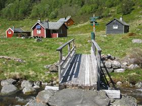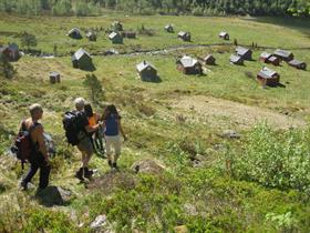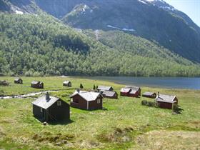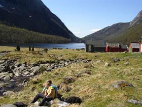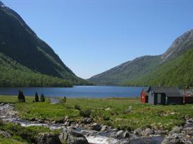 Fottur i frodig dallandskap og fjellandskap langs vatn og stølar.